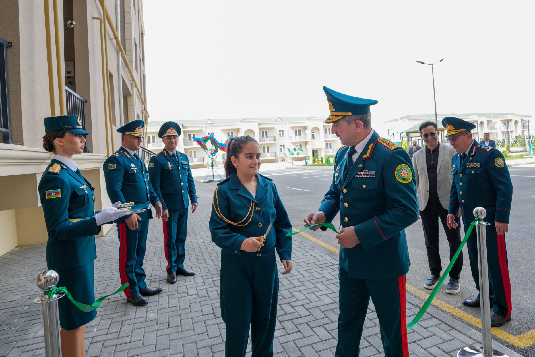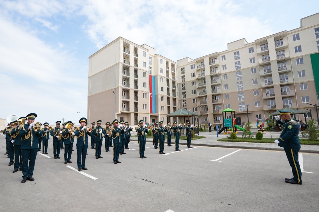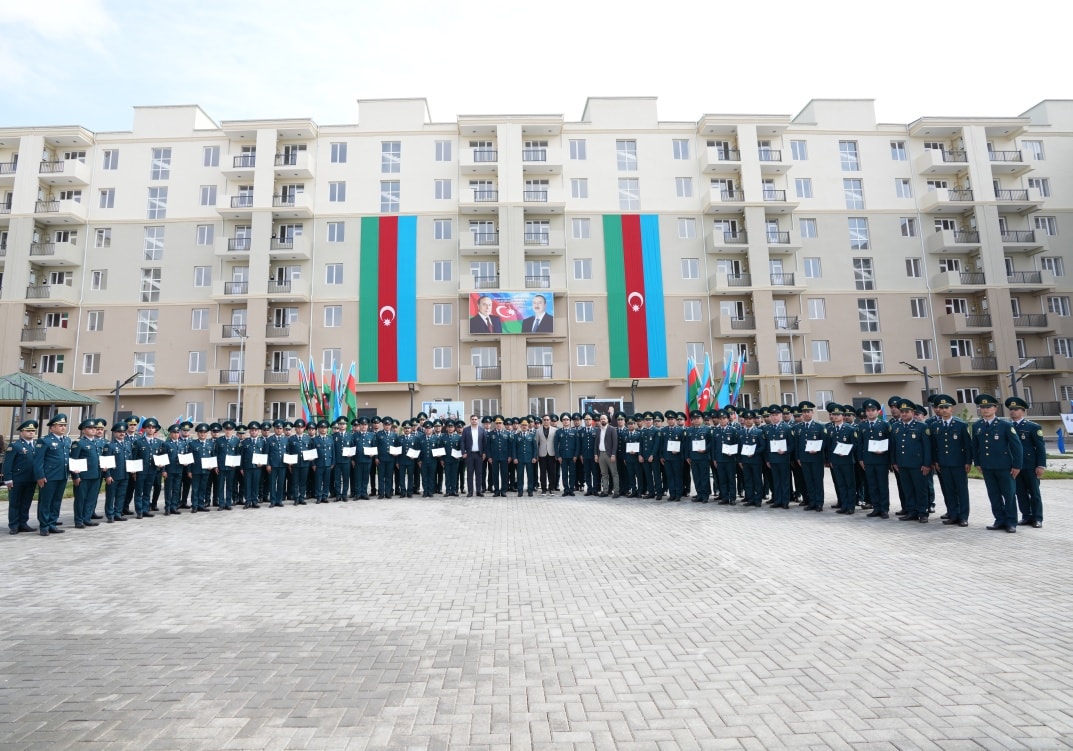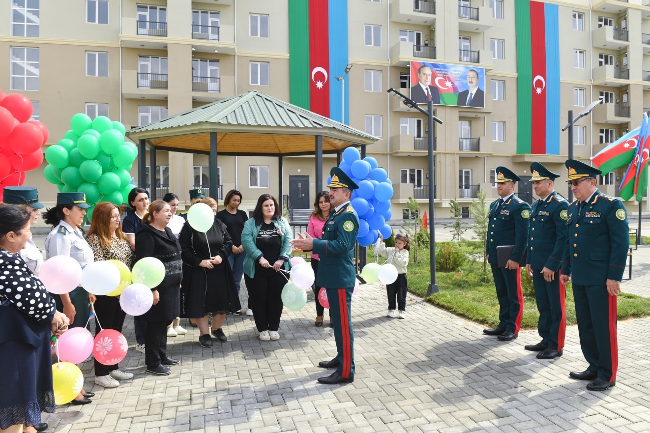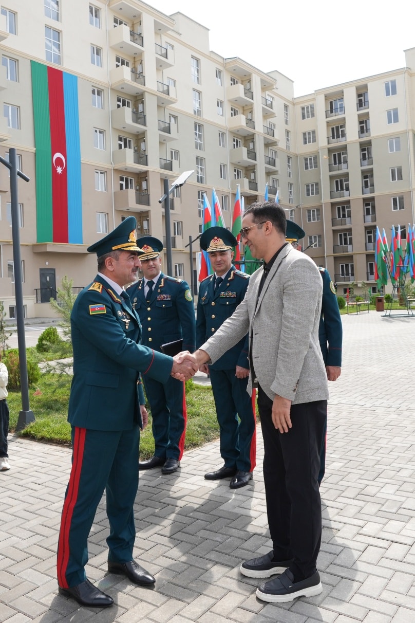 On September 19, in accordance with the instruction of the President of the Republic of Azerbaijan, Victorious Commander-in-Chief of the Armed Forces Mr. Ilham Aliyev, regarding the improvement of the social and living conditions of military personnel, the opening ceremony of a newly constructed residential complex was held at the “N”-numbered military unit of the State Border Service. The complex includes three 7-storey buildings with 8 entrances and two 2-storey buildings with 6 entrances. Following the ceremony, 270 apartments were officially handed over for service use by officers, warrant officers, and long-term active military personnel. It was noted during the event that the renovated residential buildings meet modern standards — they are equipped with water and electricity lines, elevators, centralized heating systems, kitchen equipment, and sanitary installations. Additionally, parks and sports grounds have been built in the courtyards, landscaping work was carried out, and trees and flower bushes were planted. Asphalt was laid throughout the area. Residents expressed their gratitude to the President for the special care and attention shown. After the ceremony, the Head of the State Border Service, Colonel-General Elchin Guliyev, and the head of “ArchiCO Engineering Company,” Mr. Mahammad Musayev, along with the leadership team, visited the apartments and reviewed the living conditions. The event concluded with a group photo taken with the new residents.
