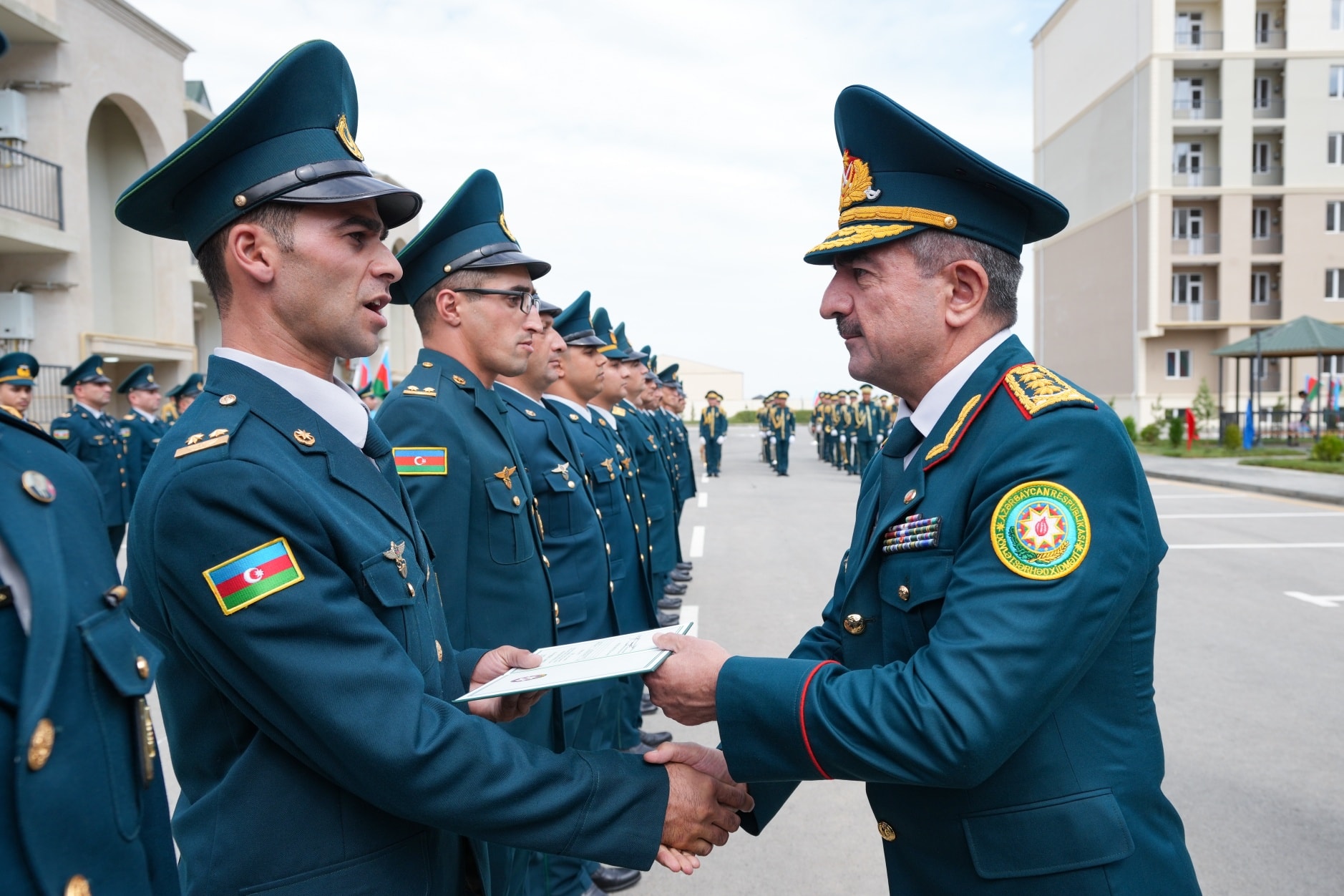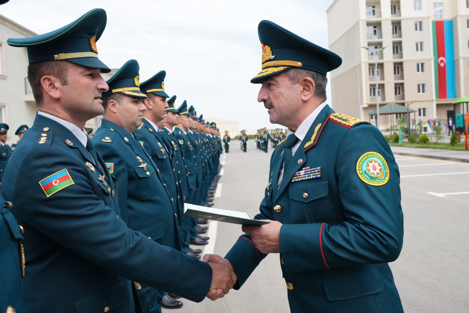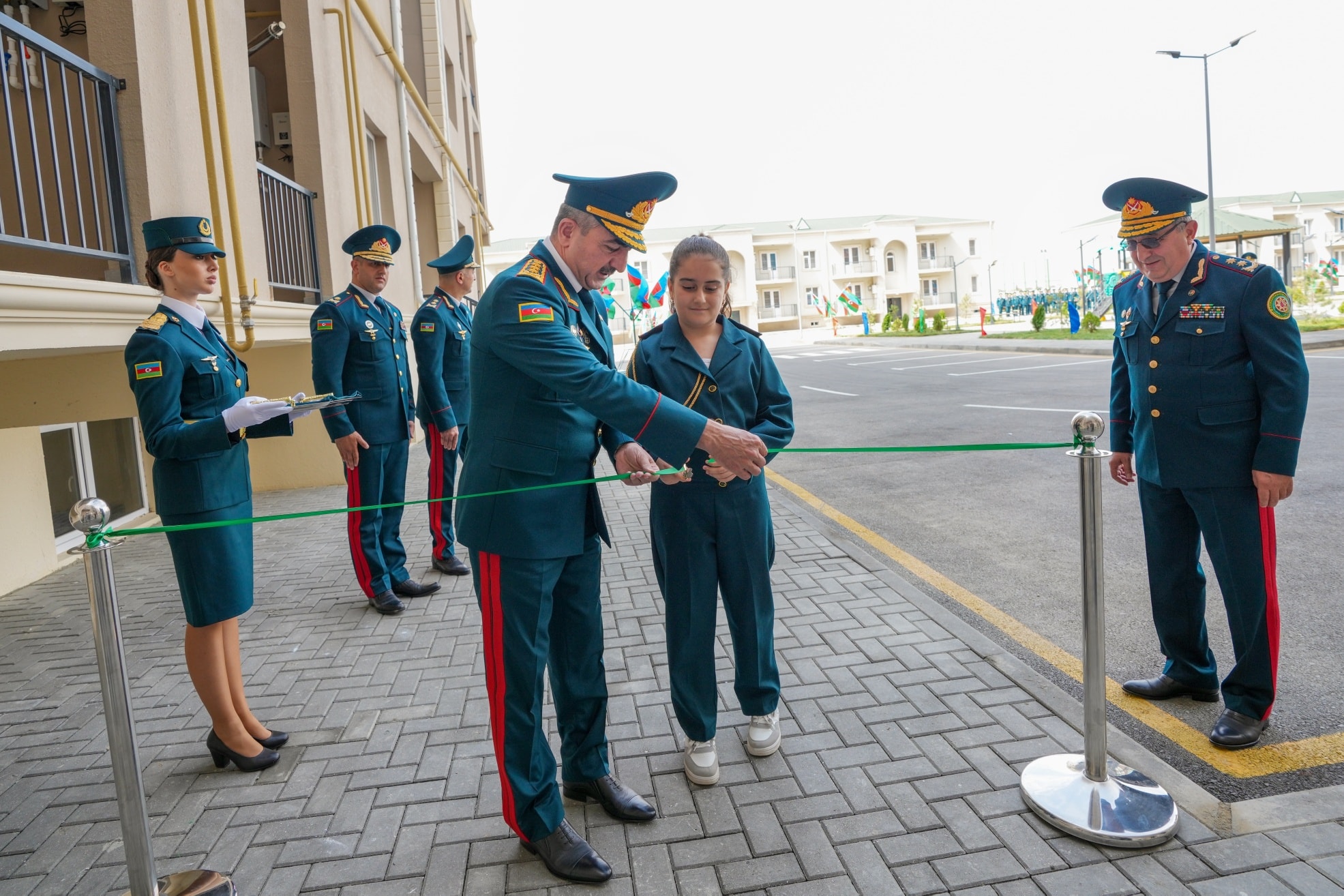 On September 19, in accordance with the instruction of the President of the Republic of Azerbaijan, Victorious Commander-in-Chief of the Armed Forces Mr. Ilham Aliyev, regarding the improvement of the social and living conditions of military personnel, the opening ceremony of a newly constructed residential complex was held at the “N”-numbered military unit of the State Border Service. The complex includes three 7-storey buildings with 8 entrances and two 2-storey buildings with 6 entrances. Following the ceremony, 270 apartments were officially handed over for service use by officers, warrant officers, and long-term active military personnel. It was noted during the event that the renovated residential buildings meet modern standards — they are equipped with water and electricity lines, elevators, centralized heating systems, kitchen equipment, and sanitary installations. Additionally, parks and sports grounds have been built in the courtyards, landscaping work was carried out, and trees and flower bushes were planted. Asphalt was laid throughout the area. Residents expressed their gratitude to the President for the special care and attention shown. After the ceremony, the Head of the State Border Service, Colonel-General Elchin Guliyev, and the head of “ArchiCO Engineering Company,” Mr. Mahammad Musayev, along with the leadership team, visited the apartments and reviewed the living conditions. The event concluded with a group photo taken with the new residents.